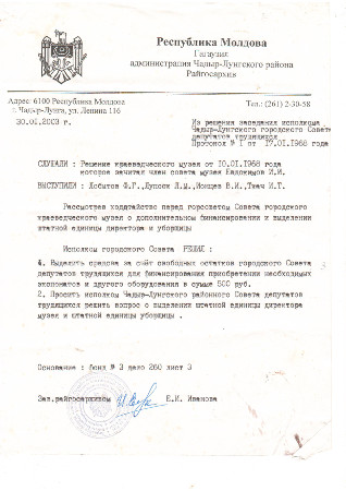 Приказом министерства культуры от 14 апреля 1969 года было выделено финансирование и утверждены штаты музея. С этого момента в нашем городе функционирует историко-краеведческий музей города Чадыр-Лунга.