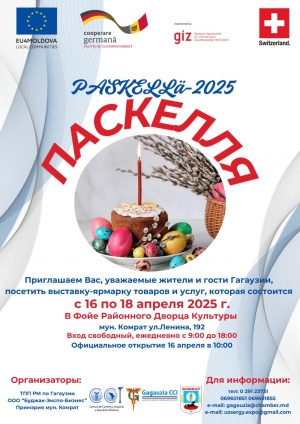 В Комрате состоится выставка- ярмарка товаров и услуг «Paskellä -2025», на которую приглашаются все жители гости Гагаузии. Предпраздничное мероприятие пройдет в 16 по 18 апреля в фойе районного Дворца культуры мун. Комрат, ул. Ленина,192.