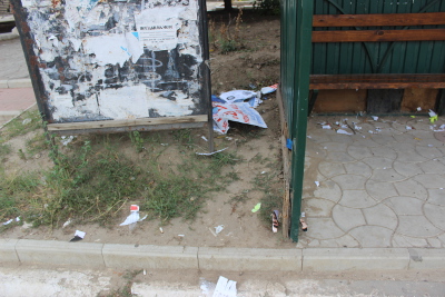 Сегодня ночью неизвестные содрали афишу со стенда, который установлен перед зданием ЕКЦ, а также засорили находящуюся рядом остановку.