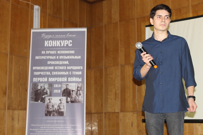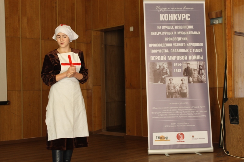 Благодаря масштабной подготовительной работа в рамках проектов, 29-30 октября в Чадыр-Лунгском лицее им. В.Мошкова был проведен ОО ИКЦ «Диалог» в сотрудничестве с партнерами проекта Конкурс литературных и музыкальных произведений, произведений устного народного творчества связанных с ПМВ 1914-1918 гг. среди учащихся и взрослого населения региона на языках народов Буджакского края. В оргкомитет Конкурса было подано свыше 80 заявок для исполнения произведений на разных языках, а количество участников перевалило за сотню. Конкурс проводился по 3 номинациям: «Лучшее исполнение литературных произведений», «Лучшее исполнение музыкальных произведений», «Лучшее видео». На данный момент уже определены победители и 17 ноября состоится торжественная церемония их награждения.