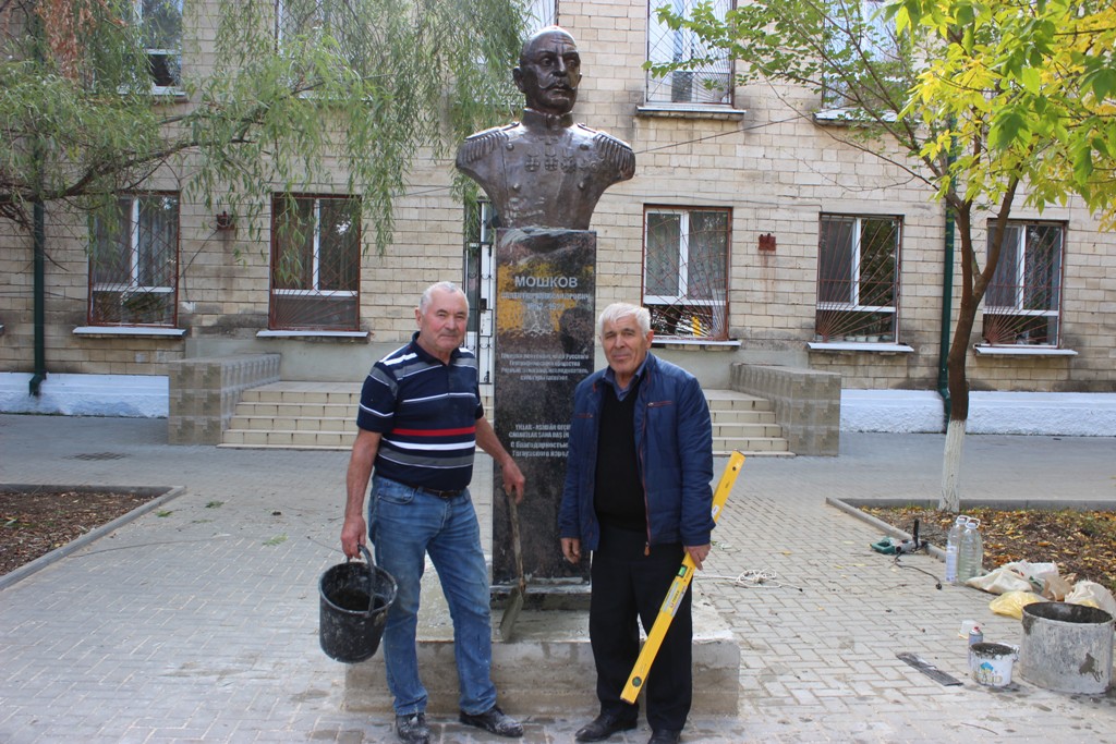 «Прежде всего, коллективу лицея им.В.Мошкова и его руководителю Любови Терзиновой. Бывшему руководителю НИЦ им. М.Маруневич Петру Пашалы и нынешнему – Ирине Константиновой, сотруднику НИЦ Григорию Радову. Хочу отметить исключительную роль и бывшего заместителя башкана Вадима Чебана, который сразу понял исключительную важность трудов В.А.Мошкова и поддержал мою идею, что этот памятник необходим. Также огромнейшую благодарность хочу выразить людям, оказавшим практическую помощь в транспортировке скульптуры из Кишинева в Чадыр-Лунгу, подготовке фундамента, заливке постамента инепосредственной установке памятника. Все необходимые строительные материалы, детали, инструменты и рабочие руки были предоставлены по моей просьбе на безвозмездной основе, за что я очень признателен этим людям: руководителю предприятия «Вамзид-груп» и всей семье Захария Кихаяла, руководителю ЗЭТО Ивану Каража, руководителю строительной организации «Амборио» Николаю Кисееву и другим. Прошу прощения, если забыл кого-то упомянуть», - сказал Николай Тукан.